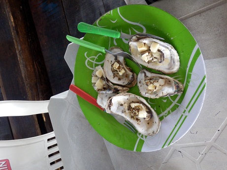 Gabi ist verarztet, und wir laufen zu einer Kneipe mit Flair und gutem Essen. Unserer Bootsausflugstruppe ist seht nett und aufgeschlossen. Hinten links ist der nette Ledermensch, der uns zur Ambulanz begleitet hatte. Es geht mit dem Boot weiter. Wir halten an einer Muschelfarm. Dann geht es auf der dem Land zugewandten Seite weiter und zurück Richtung Morro. Kurzer Zwischenstopp mit Minibesichtigung: Es gibt ein Kloster, sogar mit deutschen Inschriften. |