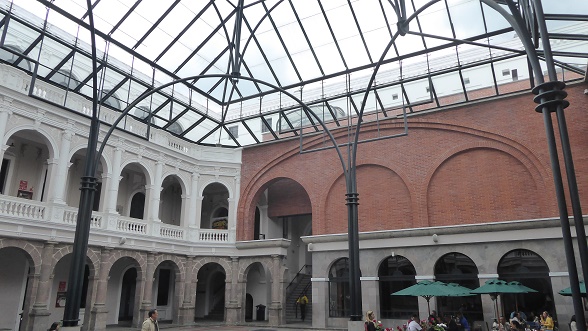 Das Eckgebäude beherrbergt die Zentralbank, in der meine 100 $ - Scheine aber nicht gewechselt werden. Das gelingt erst in einer Santanderbank gegen Gebühr von 2 %. Zahlreiche prunkvolle Innenhöfe, hier im Moment zur Registrierung der Kinder für die Schule genutzt. |