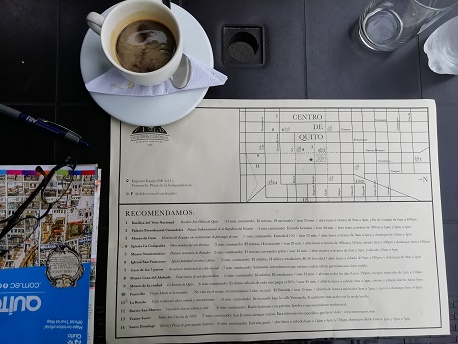 Höhe. Nicht umsonst ist Quito Weltkulturerbe. Das Wetter lässt mich auch nicht im Stich und nach kurzer Besichtigung des Unabhängigkeitsplatzes beschließe ich in einem Cafe eine Schlachtplan zu schmieden. Zum Espresso gibt es einen Stadtplan mit Empfehlungen gratis. |