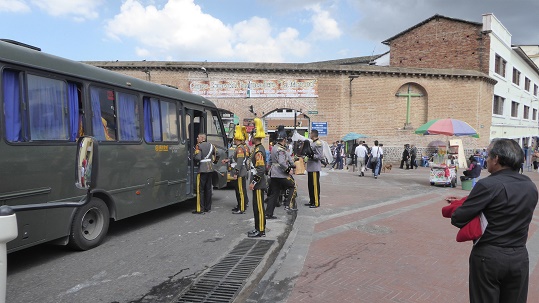 Unterhalb des Panecillo liegt die Avenida 24. de Mayo. Hier gibt es Hier wird gerade ein Wohnung entrümpelt. Musiker mit prachtvollen Uniformen bereiten sich zu einem Konzert vor. |