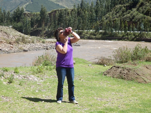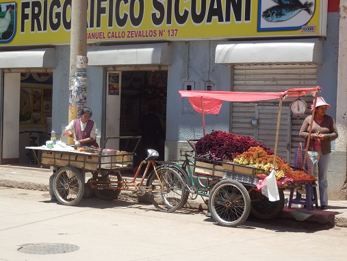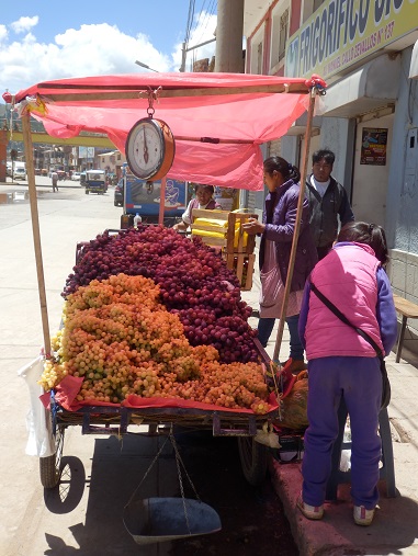 zu uns. Wir packen und fahren los. Der Wirt hat den Weg nach Puno gutbeschrieben wir finden gut heraus. Der Weg ist gut unterwegs halten wir an einem kleinen Supermarkt. ![]() Alles sehr familiär. Die Familie freut sich, weil wir umfangreich und großzügig einkaufen. Gute Einstimmung zu Sylvester. Auch Obst ist dabei, das waschen sie gleich. Der Rotwein erweist sich später als sehr süß, aber Gabi schmeckt er. Wir fotografieren und fahren weiter, um wenig später von den Trauben zu kosten. |