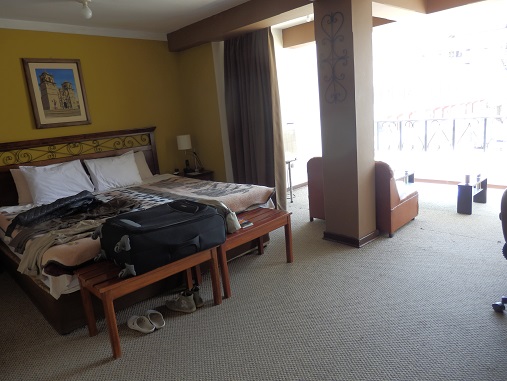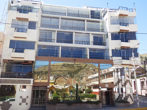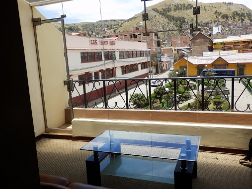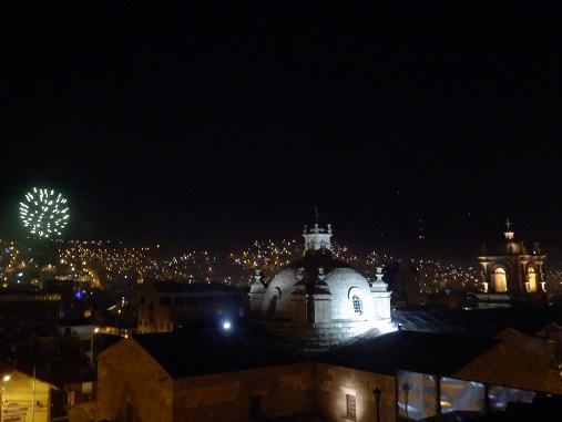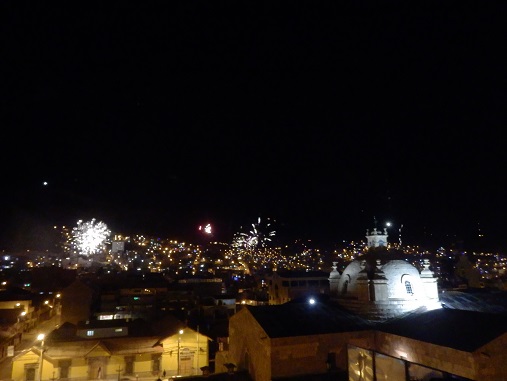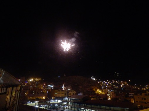 15°° Uhr in Puno einreiten. Das Hotel Conde de Lemos ist schnell gefunden, weil es mitten im Zentrum liegt. Das Zimmer ist großzügig und mit WiFi ausgestattet. Ich sperre zunächst erst mal meine SIM-Karte. Wir bereiten uns auf Sylvester vor. Ich entdecke die Dachterasse des Hotels, von der wir dann Mitternacht das Feuerwerk beobachten. ![]() |