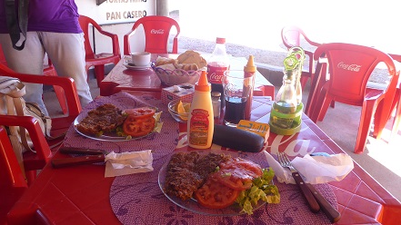 Nach dem Abstecher führt ein Schotterweg zur Schnellstraße zurück. Unterwegs lesen wird ein Junges Uruguayisches Paar auf (Mann und Frau). Die Unterhaltung ist etwas schwierig, weil sie unsere Spanischkenntnisse restlos überschätzen und die uruguayische Mundart manchmal etwas schwer zu verstehen ist. Trotzdem Machts Spaß, besonders als wir das Thema Bier anstimmen. Das geht überall und immer!! |