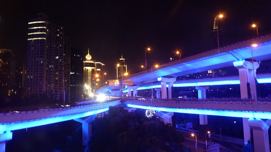 Eine Nachtaufnahme gelingt, es ist eine Straßenkreuzung mit 5 Etagen und alles beleuchtet. Mal Blau, wie hier, mal Grün, mal rot. Die LED sind auf der Unterseite des Belages angebraucht. |