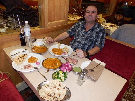 Zu unserem Essen bringt uns ein Taxi für umgerechnet 4 Euro. Er kennt einen kleinen Touristenkomplex, wo etliche einladende Gaststäten sind. Für Zehn Euro bekommen wir ein Menü mit Suppe, Fladenbrot, Gemüse, Fleisch und Früchten. Alles piko sauber und lecker. Ein vollendete Tag. Ein Taxi bringt uns in die Nähe des Hotels, wir klappern noch ein paar Straßen und Geschäft ab und sind mit dem ersten indischen Tag mehr als zufrieden. |