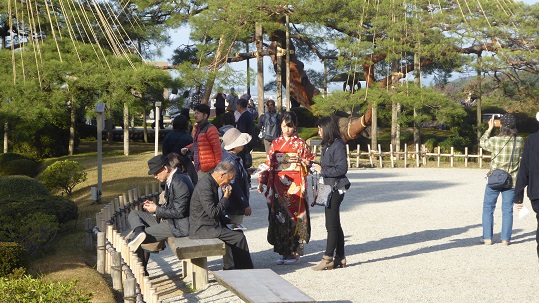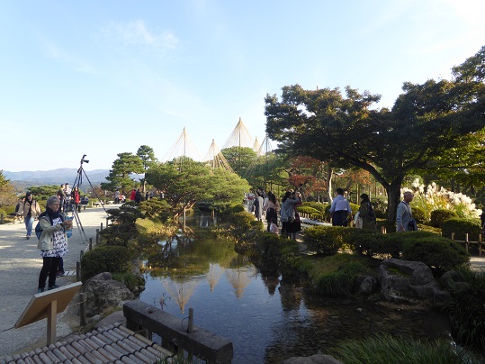 Wir besuchen den Kenrokuen Garten in Kanazawa. Er ist wie die meisten Gärten in Japan ein Landschaftsgarten mit dem typischen Erscheinungsbild der Edo-Periode (1603 - 1868) Ursprünglich war der Garten außerhalb der Burg Kanazawa am Rand der Burg angelegt worden. 1676 zog der 5. Herrscher Maeda Tsunanori das Gartenhaus in das Schloss um. Er ließ einen neuen Pavillon bauen und ließ einen Garten in der Umgebung des Schlosses anlegen. 1759 brannte der Pavillon nieder und im Zusammenhang mit dem Wiederaufbau wurde ein Wasserfall und ein Springbrunnen gebaut. In den folgenden Jahren wurde immer wieder um und ausgebaut. Es entstanden Brücken und künstliche Wasserwege. |