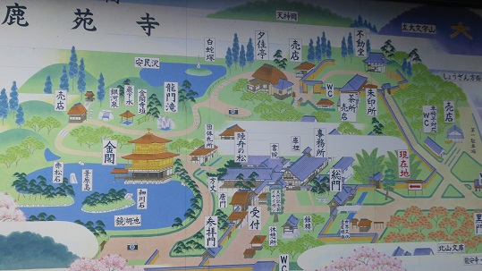 | Kyoto ist wirklich interessant. Nach dem Frühstück im Elcient Hotel Kyoto fahren wir mit dem Bus in die Stadt. Es geht zunächst zum Garten des Kinkaku, des Goldenen Tempel. Der ist in der Tat mit Gold überzogen. Zunächst waren es 2 kg, das hielt dann aber nur bis 1994, dann wurde es erneut mit Gold überzogen. Diesmal waren es 20 kg und 30 Schichten Lack Sieht echt stark aus, aber auch der Garten, ursprünglich aus dem 14. Jahrhundert. |