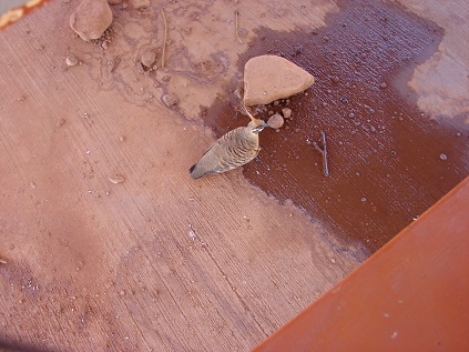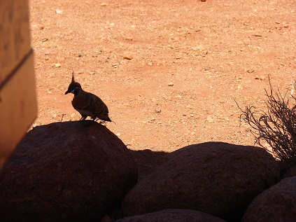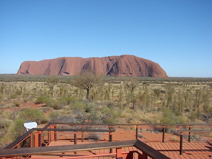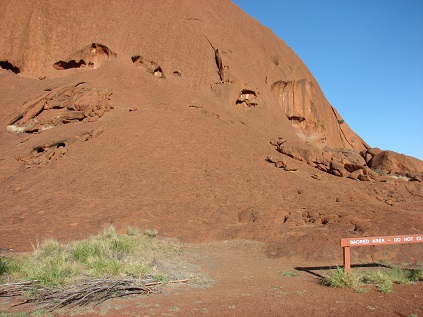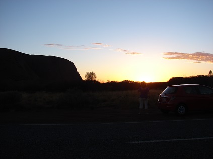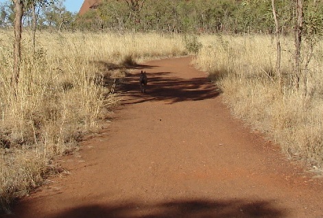 aufstehen. Ich will den Sonnenaufgang am Ayers Rock erleben. Das klappt auch alles. Gegen 7°Uhr starte ich meine Rundwanderung um den Uluru, wie er von den Aborigenees genannt wird. Auf die Besteigung verzichte ich. Erstens weiß ich nicht, wo der Einstieg beginnt und zweitens wird dringend darum gebeten, das Heiligtum zu verschonen. Dem kann man sich beugen. Die Rundwanderung ist 1 km lang, kaum anstrengend, weil es kein Gefälle gibt und kostet nich etwa zwei Stunden. Schön, interessant, aber voller Fliegen. Fast am Ende sehe ich dann noch einen von den Präriehunden Dingo, die es hier gibt. |