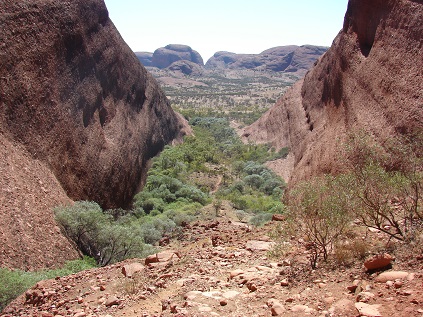 Ich steige ins Auto und fahre Richtung Kata Tjuta. Dort gibt das den Wanderweg durch eine Art Tal mit dem vielversprechenden Namen „Valley of wind talks“. Das liegt ca. 60 km vom Uluru entfernt, nach 45 min bin ich da. Es ist gegen 11°Uhr und ein Schild warnt vor der Rundwanderung wegen der Hitze. Ich gehe los und die Hitze ist wirklich beeindruckend. Wasser habe ich mit und so geht es bis zum Ausgangspunkt zurück. Fast am Ende des Weges ist dann noch ein Wasserhahn, der auch tatsächlich ziemlich warmes Wasser spendet.