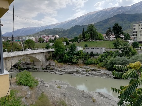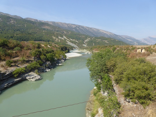 Gleich am Eingang von Permet am Ufer des Vjosa steht das Wahrzeichen Permets der Stadtfelsen. |