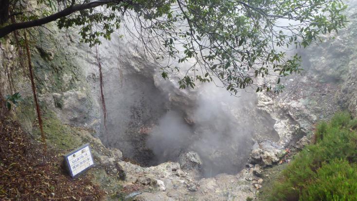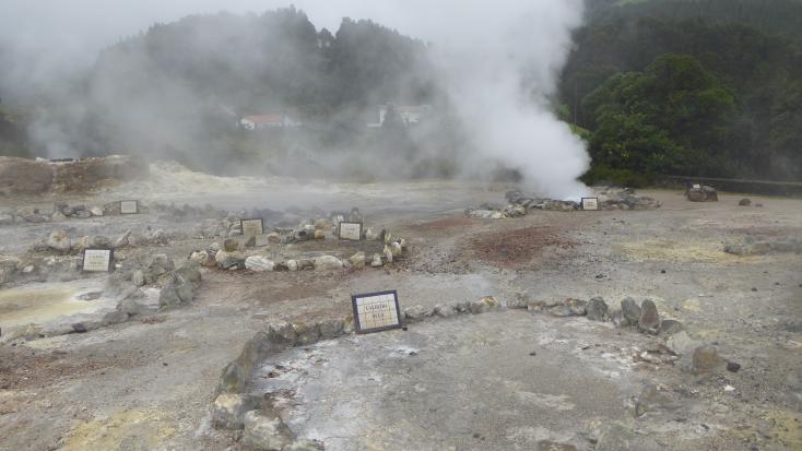 ![]() Nach dem Parkbesuch versuche ich am See weiter zu laufen. Das endet dann infloge des Regens. Aber einen Blick auf diesen seltsam gewachsenen Baum kann dann doch noch werfen. Ich fahre weiter Richtung Furnas. Aus dem kleinen Ort steigt weißer Dampf auf. Er stammt aus den vielen mehr oder weniger großen "Caldeiras" (Kessel). Kein Eintritt, keine Parkgebühr, dafür jede Menge kochendes Wasser und Schwefelgestank, beeindruckend. Die traditionelle Methode der Speisenzubereitung besteht in Furnas darin, einen Topf in ein Erdloch zu stellen und damit das Gericht von vulkanischer Hitze garen zu lassen. So etwas ähnliches habe ich auch auf Neuseeland in der Nähe von Rotorua gesehen. |