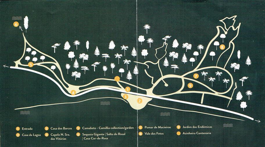 Am Parkeingang verlangt man 3 Euro Eintritt, angesichts der Größe und Schönheit des Parks vertretbar. 1 - Eingang 2 - Haus am See 3 - Bootshaus 4. Vitoriakappelle 5. Kamelien 6. Rosen-Wasserfall 7. Obstgarten 8. Tal der Farne 9. Endemischer Garten 10. Steineiche |