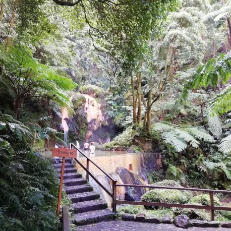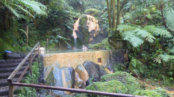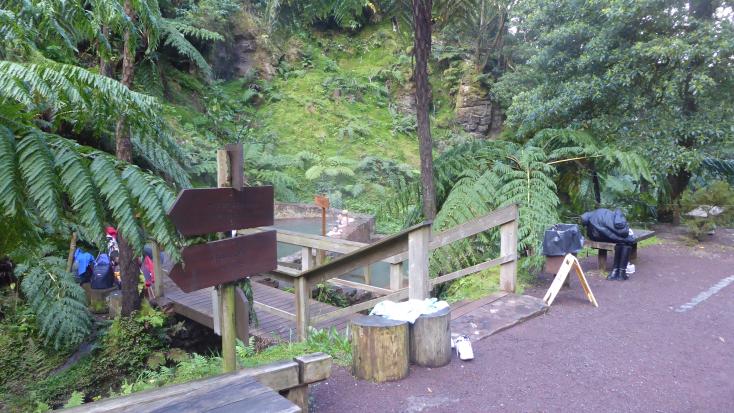 Nächste Station ist die "Caldeira Velha". Hier kann man das Thermalwasser nicht nur sehen für 7 Euro auch darin baden. Eine Ausstellung informiert über die Caldeiras und die Fauna und Flora in der Nähe des Lagoa do Fogo. |