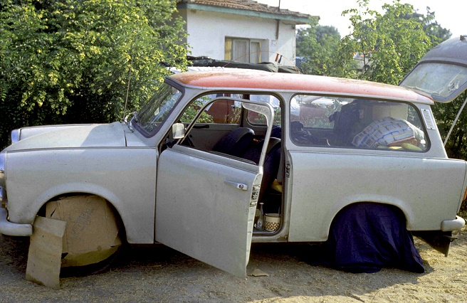 Wir treffen zwei junger Frauen mit ihren Kindern aus Waiblingen bei Stuttgart. Die ein ist mit ihrem Freund aus Leipzig hier verabredet. Es ist ein herzliches Deutsch-Deutsches Verhältnis. Abend wird gefeiert, ein Bulgare will die Damen mit ihren Kindern in ihr Quartier nach Sosopol fahren. Ich gebe ihm die Schlüssel meines Trabbis aber er kommt mit dem Zweitakter nicht klar. Eine verhängnisvolle Entscheidung, ich setze mich ans Steuer, die 8 km geht das schon. Am Ortseingang von Sosopol stehen die Männer in Uniform mit Elektronik bewaffnet und fangen mich ab. Das Ende vom Lied, sie fahren mich mit meinem Trabbi zurück nach Arkutino, die Familien nach Sosopol und nehmen vorsichtshalber meinen Personalausweis mit. Bis morgen dann in Burgas! Der Spaß kostet 200 Leva (rund 600 Ostmark), eine Meldung an die Botschaft der DDR wäre noch schlimmer. Ich verkaufe mein Teleobjektiv und bezahle. Am Strand dann in Arkutino Deutsch-Deutsche Solidarität. Die Damen sammeln und fragen nur noch: DM oder Leva? Welche Frage, aber hier in Bulgarien nützen uns nur die Leva. Schweren Herzens. Der Schaden ist begradigt, das Leben geht weiter, wir bleiben noch einen Tag und fahren Richtung Nessebar. |
