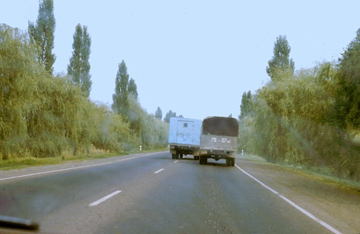 ![]() Es liegen bis Lwow noch 260 km, geschätzt 5 Stunden Fahrt vor uns, aber es ist schon später Nachmittag und die teilweise uralten LKW fahren nicht sehr schnell und ich traue mich nicht, zu überholen. |