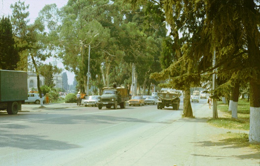 er hier Verwandte. Am nächsten Abend holt er uns mit seinem Lada 1500 ab und wir fahren in das Dorf, wo eine gefühlt 20 m lange Tafel mit 30 bis 40 Leuten, Frauen und Männer, auf uns wartet. Essen und Trinken bis der Arzt kommt. Unglaublich, ein netter Mensch aus Tiflis bietet uns sogar ein Geldgeschenk an!!!! Unserer Offizier trink mindestens eine FLasche Wodka und wir wissen nicht, wie wir in unser Quartier kommen sollen. Er fährt uns!!! Aus der japanischen Stereoanlage pustet "I want to break free" von Queen. Wahnsinn. Wir fahren die Strecke am nächsten Tag selber ab. Serpentinen und Steilküste. UNs wird schlecht! |