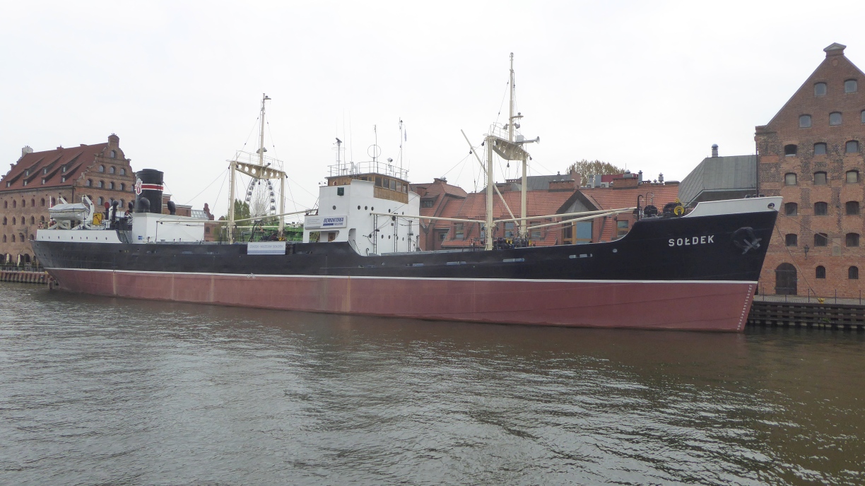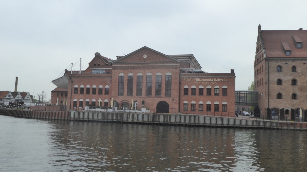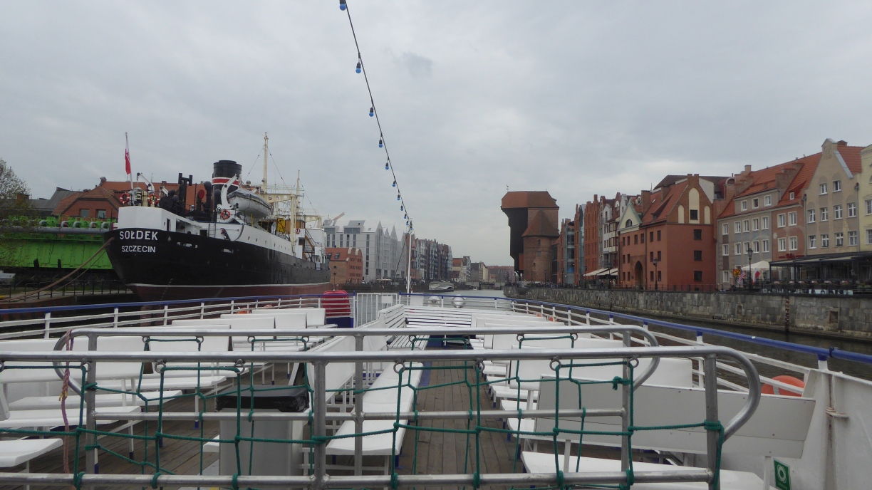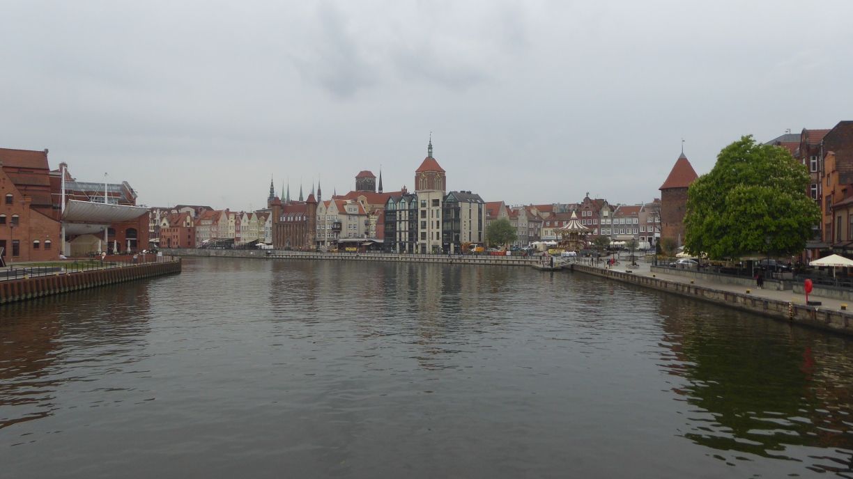 Linksseitig der Motława Auf der rechten Seite Hotels, Bars und ein Museumsschiff, rechts hinten. In der Mitte ist eine drehbare Brücke, die die beiden Ufer verbindet und bei Schiffsverkehr gedreht wird. |