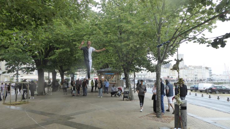 Am Hafen stellt ein Seilakrobat seine sängerischen Fähigkeiten zur Schau. |