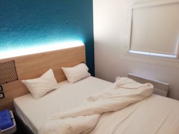Am späten Nachmittag lande ich in Bayonne im HotelF1 für 51 Euro. (44 kostet es ohne Bad). Ein Handtuch gibt es übrigens nicht, man kann eines kaufen oder bringt eines mit! Das Zimmer ist kaum größer als das Doppelbett, aber die Matratzen sind gut. Das Bad hat alles, was man braucht, ist aber eben auch nicht größer, als das was drin ist. Auf dem Flur ist ein Getränkeautomat. Hygiene wird ganz groß geschrieben, alles mit Maske. |